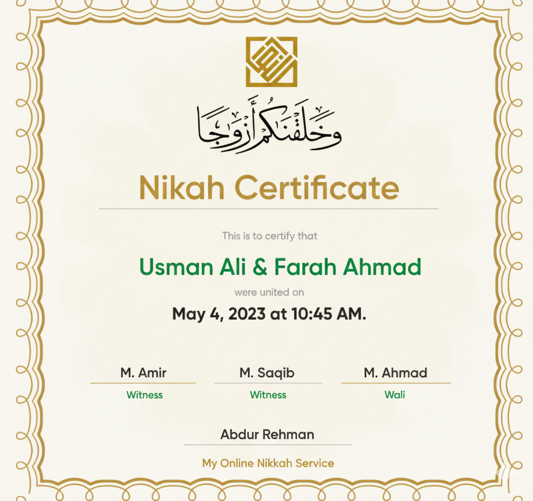 Celebrate your sacred union without boundaries. Our online Nikah platform connects you, your partner, Wali (if required), witnesses, and a certified Imam through a secure live video session — ensuring every detail aligns with Islamic values and Shariah principles. Experience the beauty of your Nikah from the comfort of your home, surrounded by your loved ones, while we take care of all formalities. Once your ceremony is completed, your official Nikah Nama (marriage certificate) is verified and issued promptly — digitally signed, sealed, and ready for download. It’s a smooth, modern, and spiritually fulfilling way to begin your forever together.